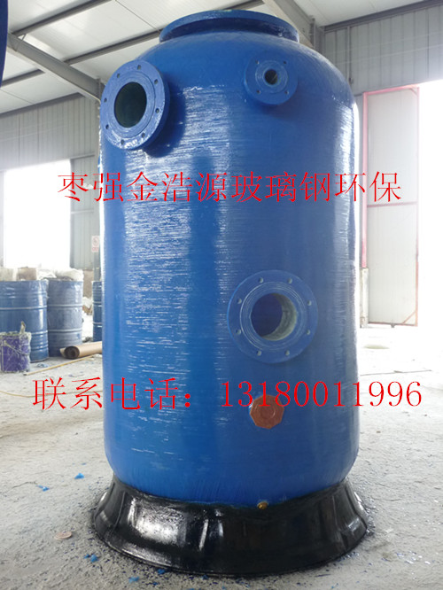 玻璃钢过滤罐由树脂和玻璃纤维缠绕而成的复合材料制成,且有整体成型热塑性内胆(其中有吹塑、滚塑)与 同规格的钢制容器相比,具有强度高、重量轻、耐腐蚀, 使用寿命长等优点。主要用于水处理的软水处理方面,起盛水容器的作用.通过置换反应降低水中的 钙,镁浓度,使水中不易形成碳酸盐垢,形成软水。